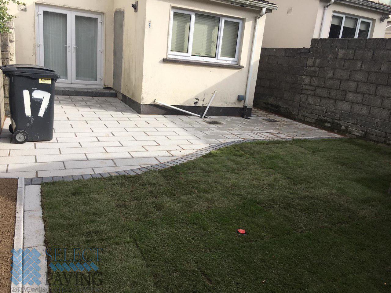 Here is a new patio installation by Select Paving Kildare. Experts at tarmac, patio and block paving installations in County Kildare. The existing patio area was completely unkempt. We redesigned the entire area by adding a new foundation, a new soil and roll on turf (grass) for the lawn, a retained granite flower bed and 2 new recessed inspection chambers to allow the blending in of the manhole covers into the patio.